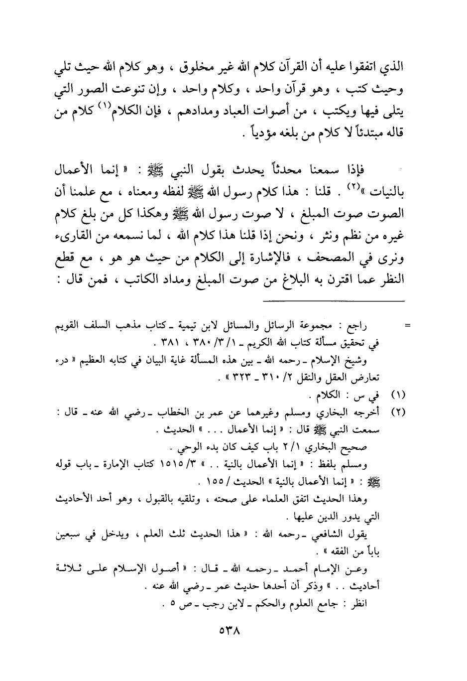 فإذا سمعنا محدثًا يحدث بقول النبي - صلى الله عليه وسلم -: "إنما الأعمال بالنيات" (¬2). قلنا: هذا كلام رسول الله - صلى الله عليه وسلم - لفظه ومعناه، مع علمنا أن الصوت صوت المبلغ، لا صوت رسول الله - صلى الله عليه وسلم - وهكذا كل من بلغ كلام غيره من نظم ونثر، ونحن إذا قلنا هذا كلام الله، لما نسمعه من القارئ ونرى في المصحف، فالإشارة إلى الكلام من حيث هو هو، مع قطع النظر عما اقترن به البلاع من صوت المبلغ ومداد الكاتب، فمن قال: