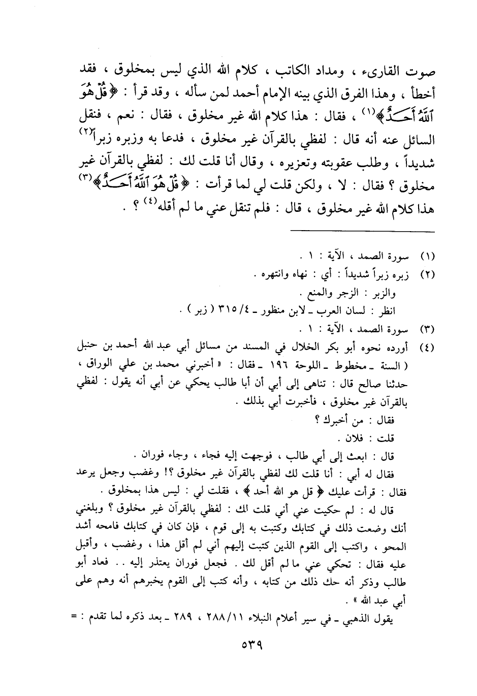 صوت القارئ، ومداد الكاتب، كلام الله الَّذي ليس بمخلوق، فقد أخطأ، وهذا الفرق الَّذي بينه الإمام أحمد لمن سأله، وقد قرأ: {قُلْ هُوَ اللَّهُ أَحَدٌ} (¬1)، فقال: هذا كلام الله غير مخلوق، فقال: نعم، فنقل السائل عنه أنَّه قال: لفظي بالقرآن غير مخلوق، فدعا به وزبره زبرًا (¬2) شديدًا، وطلب عقوبته وتعزيره، وقال أنا قلت لك: لفظي بالقرآن غير مخلوق؟ فقال: لا، ولكن قلت لي لما قرأت: {قُلْ هُوَ اللَّهُ أَحَدٌ} (¬3) هذا كلام الله غير مخلوق، قال: فلم تنقل عني ما لم أقله (¬4)؟.