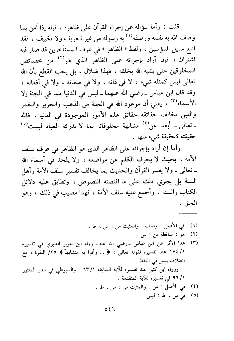 قلت: وأما سؤاله عن إجراء القرآن على ظاهره، فإنه إذا آمن بما وصف الله به نفسه ووصفه (¬1) به رسوله من غير تحريف ولا تكييف، فقد اتبع سبيل المؤمنين، ولفظ "الظاهر" في عرف المستأخرين قد صار فيه اشتراك، فإن أراد بإجرائه على الظاهر الَّذي هو (¬2) من خصائص المخلوقين حتَّى يشبه الله بخلقه، فهذا ضلال، بل يجب القطع بأن الله تعالى ليس كمثله شيء، لا في ذاته، ولا في صفاته، ولا في أفعاله، وقد قال ابن عباس - رضي الله عنهما - ليس في الدنيا مما في الجنّة إلا الأسماء (¬3)، يعني أن موعود الله في الجنّة من الذهب والحرير والخمر واللبن تخالف حقائقه حقائق هذه الأمور الموجودة في الدنيا، فالله -تعالى- أبعد عن (¬4) مشابهة مخلوقاته بما لا يدركه العباد ليست (¬5) حقيقته كحقيقة شيء منها.