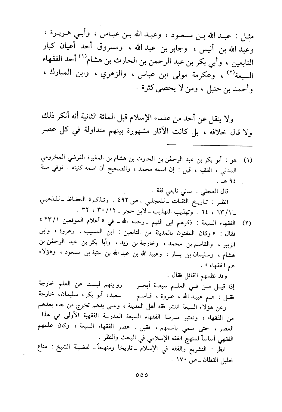 (¬2) الفقهاء السبعة: ذكرهم ابن القيم -رحمه الله- في "أعلام الموقعين 1/ 23 " فقال: "وكان المفتون بالمدينة من التابعين: ابن المسيب، وعروة، وابن الزبير، والقاسم بن محمَّد، وخارجة بن زيد، وأبا بكر بن عبد الرحمن بن هشام، وسليمان بن يسار، وعبيد الله بن عبد الله بن عتبة بن مسعود، وهؤلاء هم الفقهاء".
