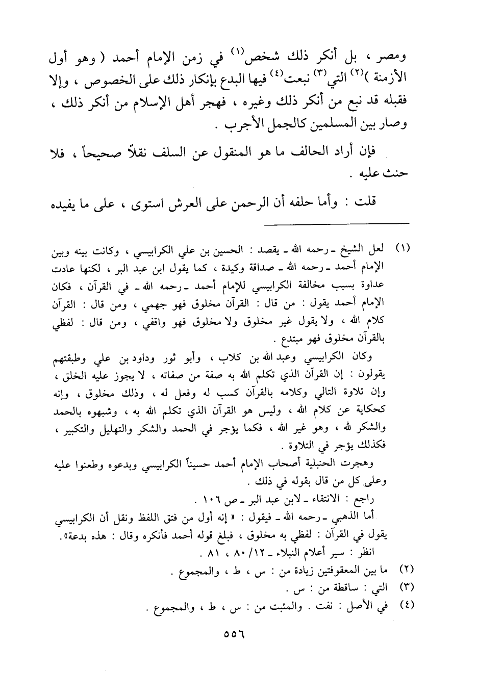 (¬1) لعل الشيخ -رحمه الله- يقصد: الحسين بن علي الكرابيسي، وكانت بينه وبين الإِمام أحمد -رحمه الله- صداقة وكيدة، كما يقول ابن عبد البر، لكنها عادت عداوة بسبب مخالفة الكرابيسي للإمام أحمد -رحمه الله- في القرآن، فكان الإِمام أحمد يقول: من قال: القرآن مخلوق فهو جهمي، ومن قال: القرآن كلام الله، ولا يقول غير مخلوق ولا مخلوق فهو واقفي، ومن قال: لفظي بالقرآن مخلوق فهو مبتدع.