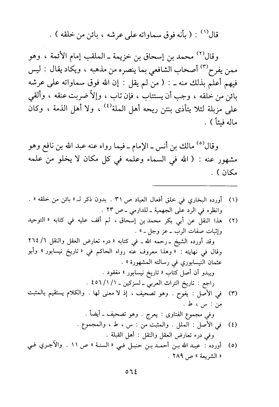 (¬2) هذا النقل عن أبي بكر محمد بن إسحاق، لم أقف عليه في كتابه "التوحيد وإثبات صفات الرب -عَزَّ وَجَلَّ-".