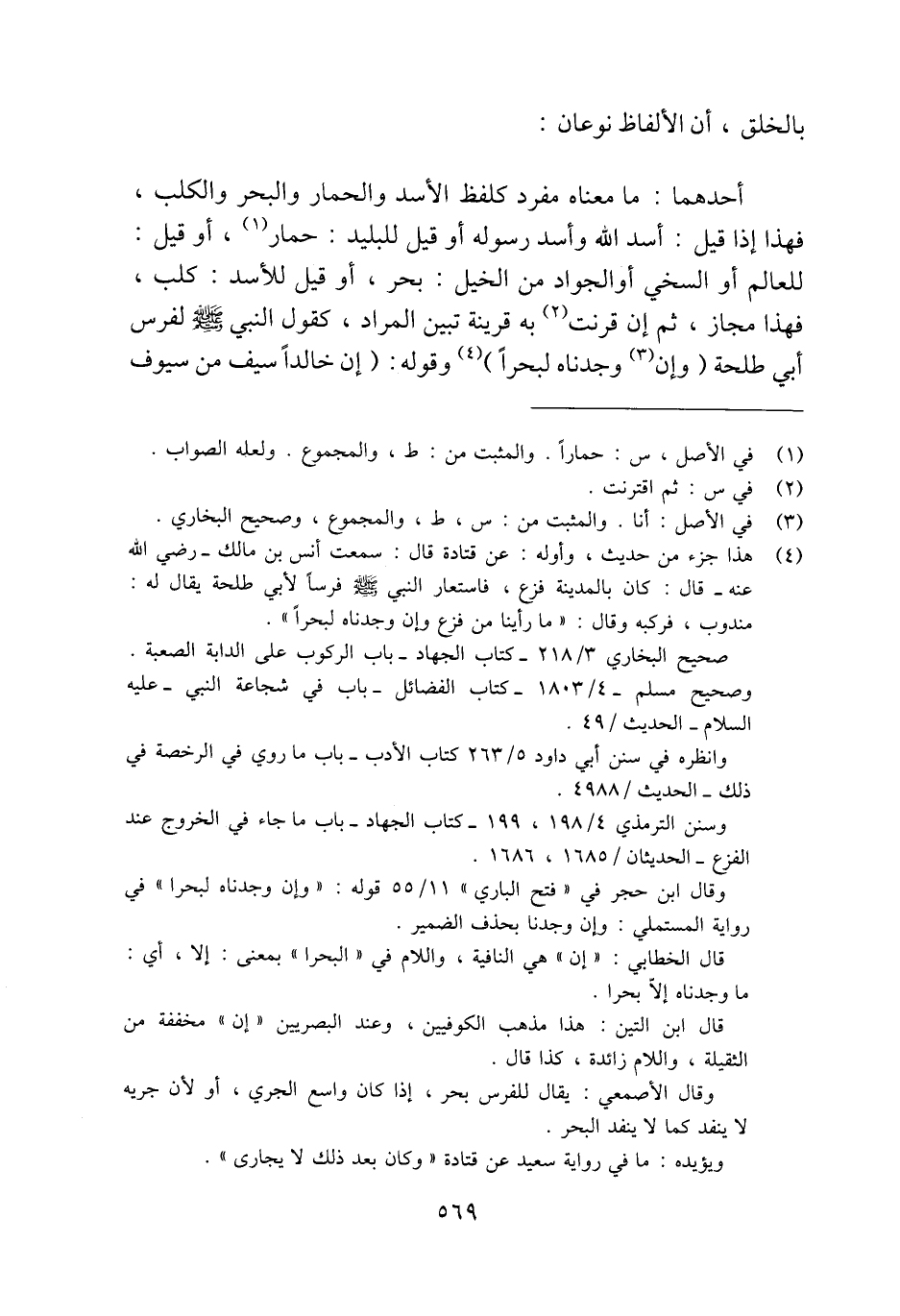 أحدهما: ما معناه مفرد كلفظ الأسد والحمار والبحر والكلب، فهذا إذا قيل: أسد الله وأسد رسوله أو قيل للبليد: حمار (¬1)، أو قيل: للعالم أو السخي أو الجواد من الخيل: بحر، أو قيل للأسد: كلب، فإذا مجاز، ثم إن قرنت (¬2) به قرينة تبين المراد، يقول النبي - صلى الله عليه وسلم - لفرس أبي طلحة (وإن (¬3) وجدناه لبحرًا) (¬4) وقوله: (إن خالدًا سيف من سيوف