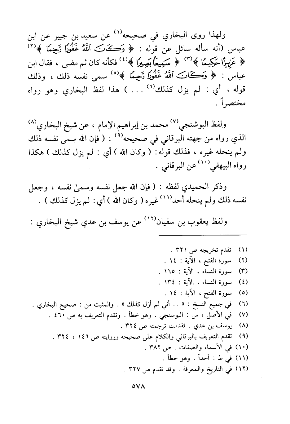 ولفظ البوشنجي (¬7) محمَّد بن إبراهيم الإِمام، عن شيخ البخاري (¬8) الذي رواه من جهته البرقاني في صحيحه (¬9): (فإن الله سمى نفسه ذلك ولم ينحله غيره، فذلك قوله: (وكان الله) أي: لم يزل كذلك) هكذا رواه البيهقي (¬10) عن البرقاني.