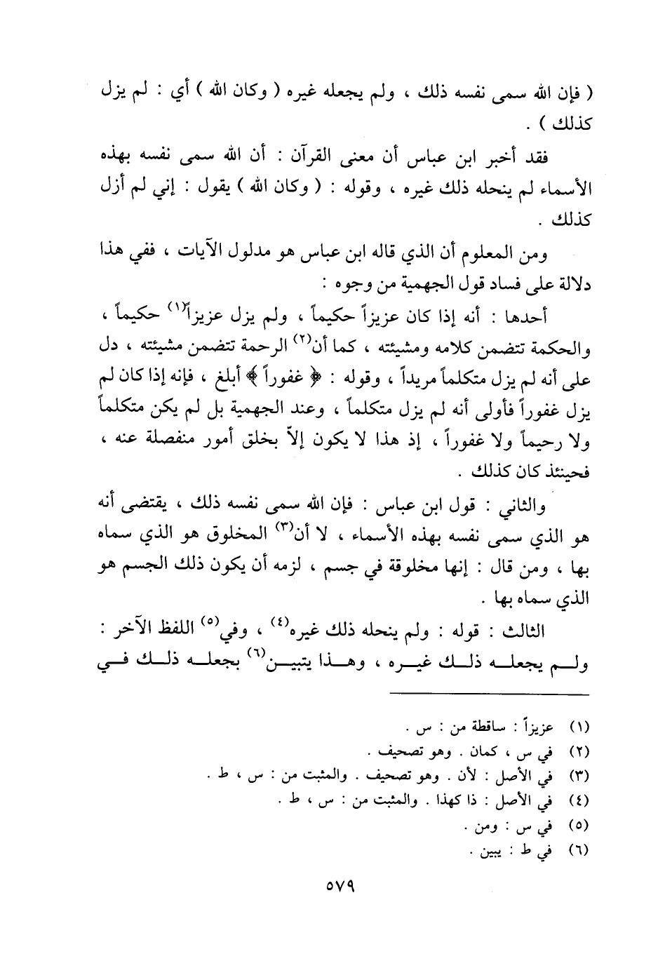 أحدها: أنه إذا كان عزيزًا حكيمًا، ولم يزل عزيزا (¬1) حكيمًا، والحكمة تتضمن كلامه ومشيئته، كما أن (¬2) الرحمة تتضمن مشيئته، دل على أنه لم يزل متكلمًا مريدًا، وقوله: {غَفُورًا} أبلغ، فإنه إذا كان لم يزل غفورًا فأولى أنه لم يزل متكلمًا، وعند الجهمية بل لم يكن متكلمًا ولا رحيمًا ولا غفورًا، إذ هذا لا يكون إلّا بخلق أمور منفصلة عنه، فحينئذ كان كذلك.