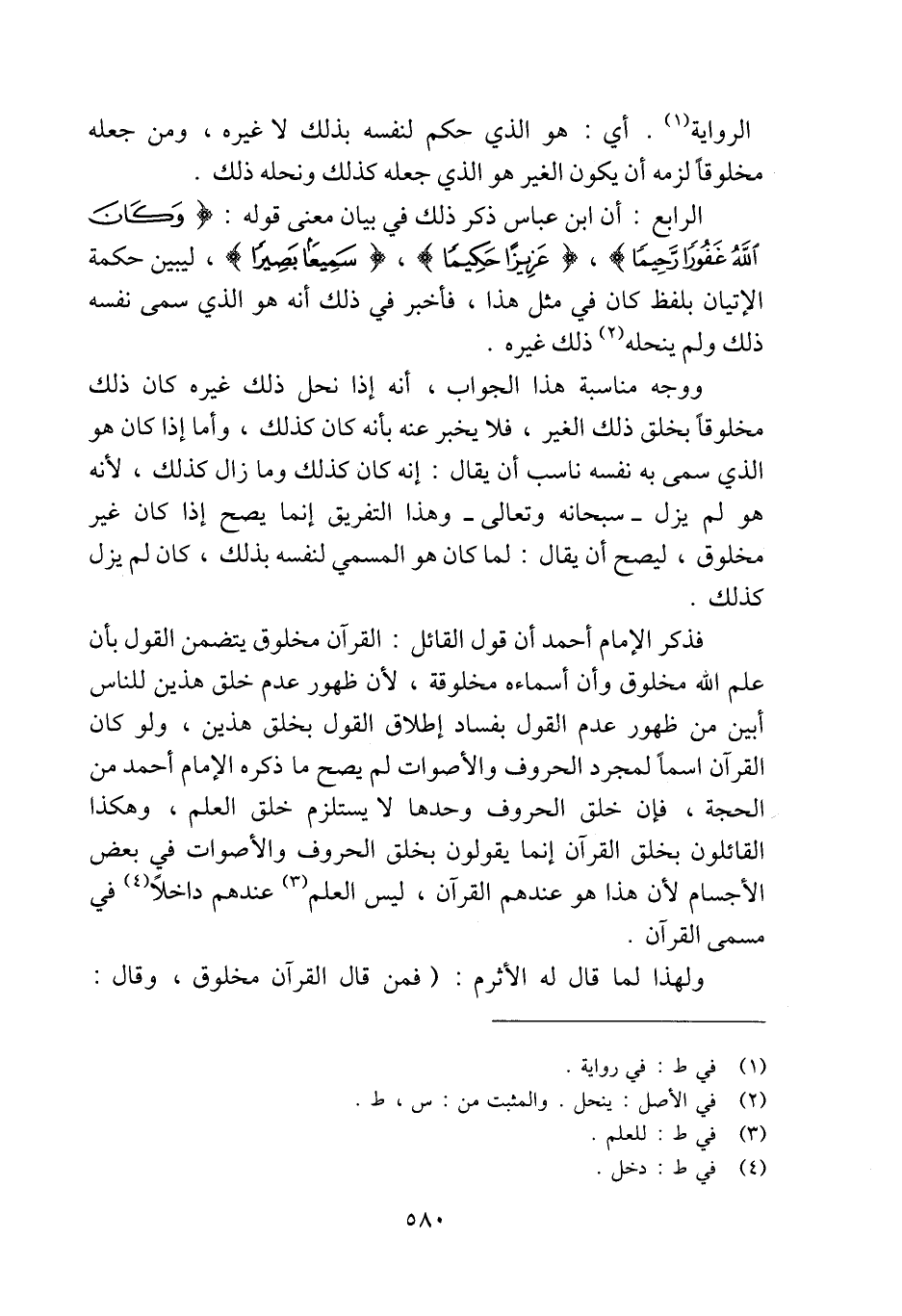 الرواية (¬1). أي: هو الذي حكم لنفسه بذلك لا غيره، ومن جعله مخلوقًا لزمه أن يكون الغير هو الذي جعله كذلك ونحله ذلك.
