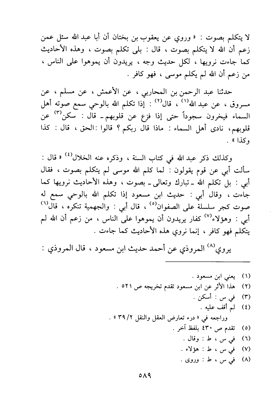 وكذلك ذكر عبد الله في كتاب السنة، وذكره عنه الخلال (¬4) "قال: سألت أبي عن قوم يقولون: لما كلم الله موسى لم يتكلم بصوت، فقال أبي: بل تكلم الله -تبارك وتعالى- بصوت، وهذه الأحاديث نرويها كما جاءت، وقال أبي: حديث ابن مسعود إذا تكلم الله بالوحي سمع له صوت كجر سلسلة على الصفوان (¬5)، قال أبي: والجهمية تنكره، قال (¬6) أبي: وهؤلاء (¬7) كفار يريدون أن يموهوا على الناس، من زعم أن الله لم يتكلم فهو كافر، إنما نروي هذه الأحاديث كما جاءت.