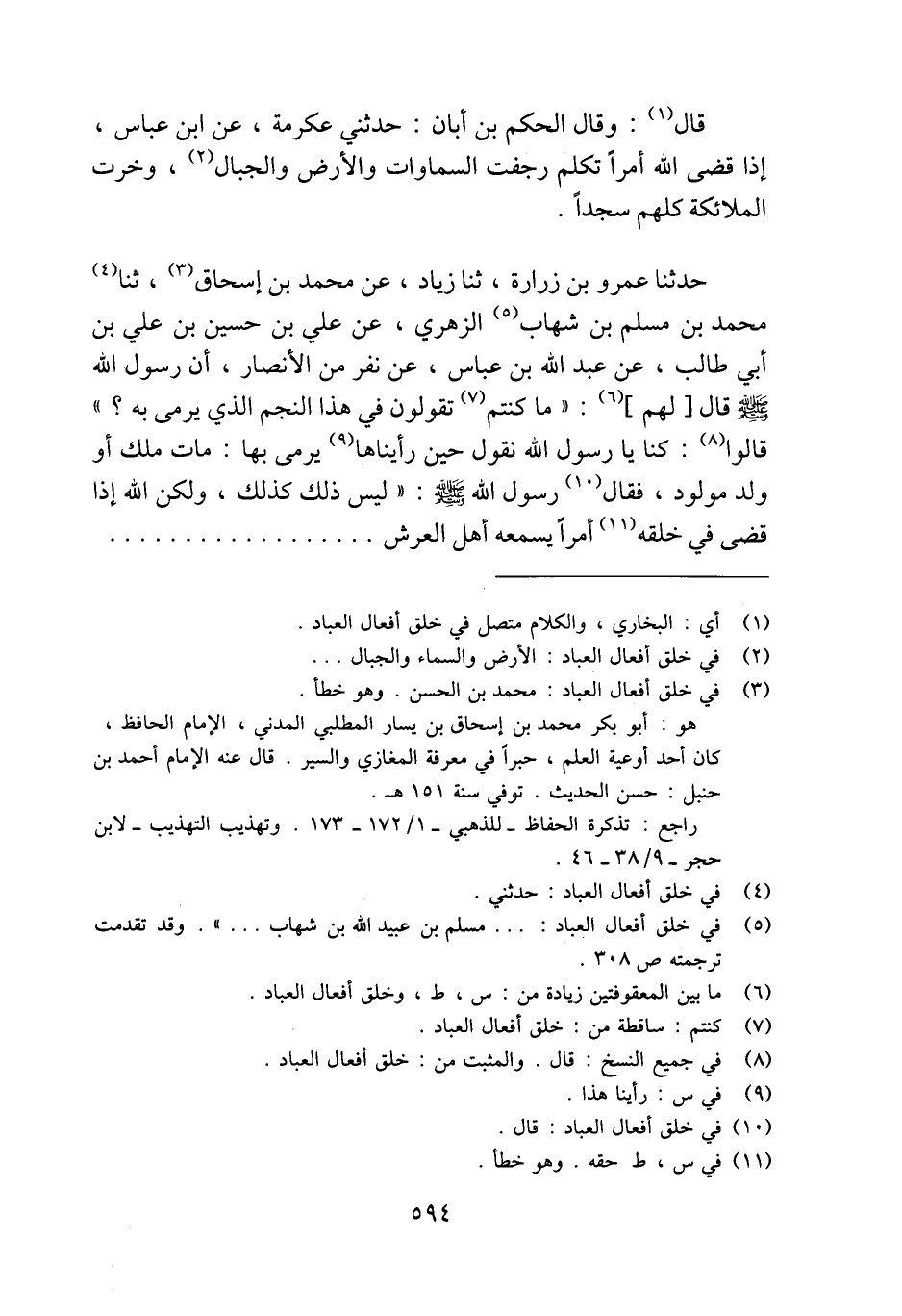 حدثنا عمرو بن زرارة، ثنا زياد، عن محمَّد بن إسحاق (¬3)، ثنا (¬4) محمد بن مسلم بن شهاب (¬5) الزهريّ، عن علي بن حسين بن علي بن أبي طالب، عن عبد الله بن عباس، عن نفر من الأنصار، أن رسول الله - صلى الله عليه وسلم - قال [لهم] (¬6): "ما كنتم (¬7) تقولون في هذا النجم الذي يرمى به؟ " قالوا (¬8): كنا يا رسول الله نقول حين رأيناها (¬9) يرمى بها: مات ملك أو ولد مولود، فقال (¬10) رسول الله - صلى الله عليه وسلم -: "ليس ذلك كذلك، ولكن الله إذا قضى في خلقه (¬11) أمرًا يسمعه أهل العرش. . . . . . . . . . . . . . . . . . .