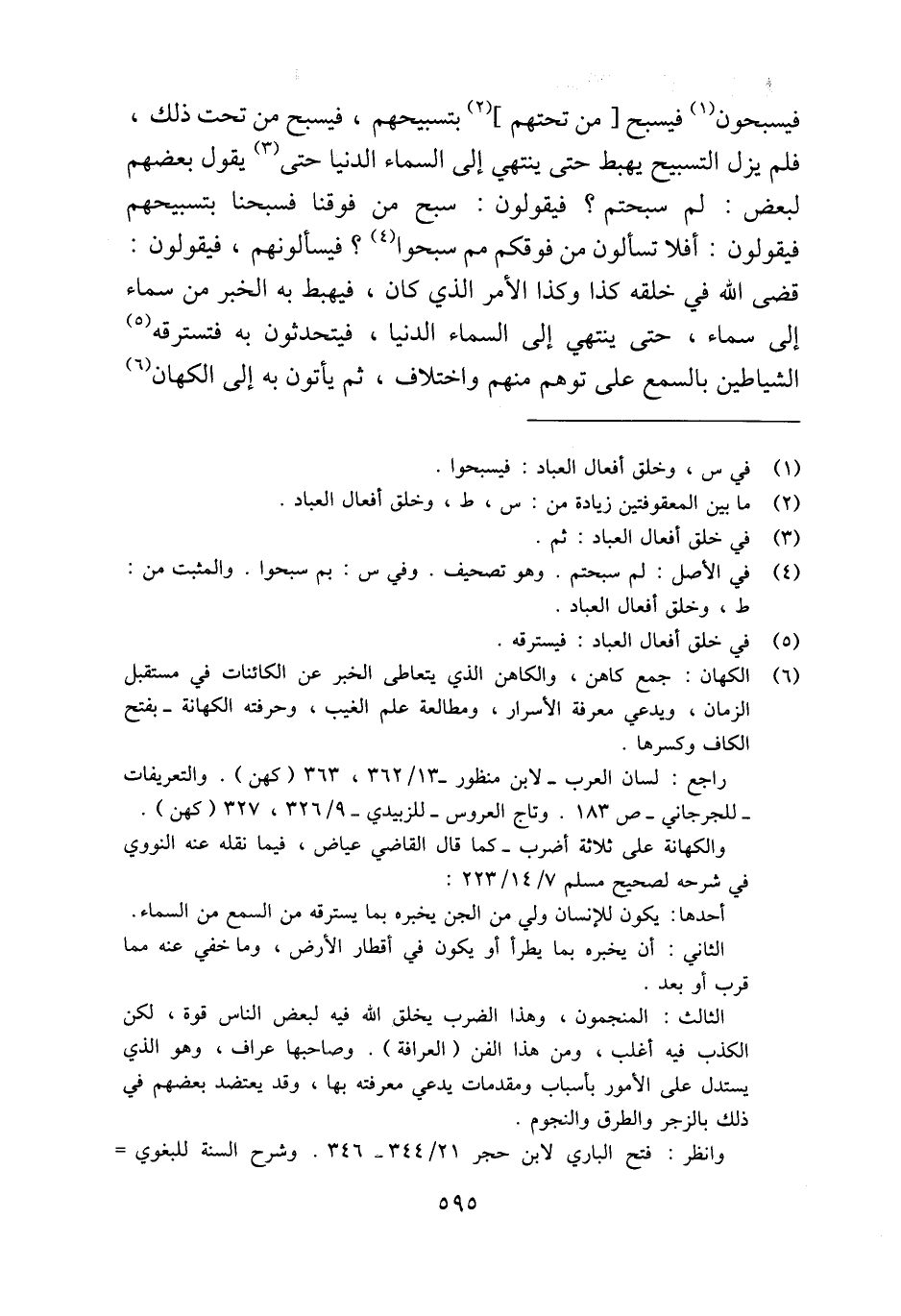 فيسبحون (¬1) فيسبح [من تحتهم] (¬2) بتسبيحهم، فيسبح من تحت ذلك، فلم يزل التسبيح يهبط حتى ينتهي إلى السماء الدنيا حتى (¬3) يقول بعضهم لبعض: لم سبحتم؟ فيقولون: سبح من فوقنا فسبحنا بتسبيحهم فيقولون: أفلا تسألون من فوقكم مم سبحوا (¬4)؟ فيسألونهم، فيقولون: قضى الله في خلقه كذا وكذا الأمر الذي كان، فيهبط به الخبر من سماء إلى سماء، حتى ينتهي إلى السماء الدنيا، فيتحدثون به فتسترقه (¬5) الشياطين بالسمع على توهم منهم واختلاف، ثم يأتون به إلى الكهان (¬6)