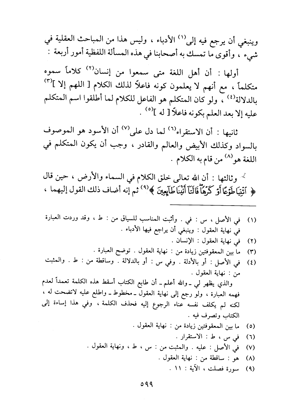 (¬1) في الأصل، س: في. وأثبت المناسب للسياق من: ط، وقد وردت العبارة في نهاية العقول: وينبغي أن يراجع فيها الأدباء.