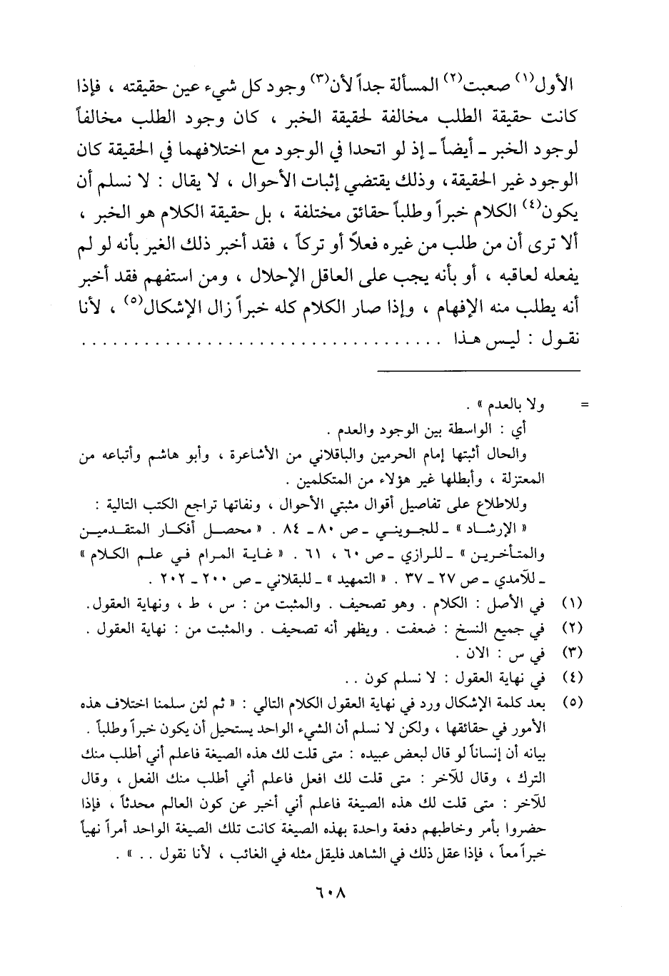 (¬5) بعد كلمة الإشكال ورد في نهاية العقول الكلام التالي: "ثم لئن سلمنا اختلاف هذه الأمور في حقائقها، ولكن لا نسلم أن الشيء الواحد يستحيل أن يكون خبرًا وطلبًا.