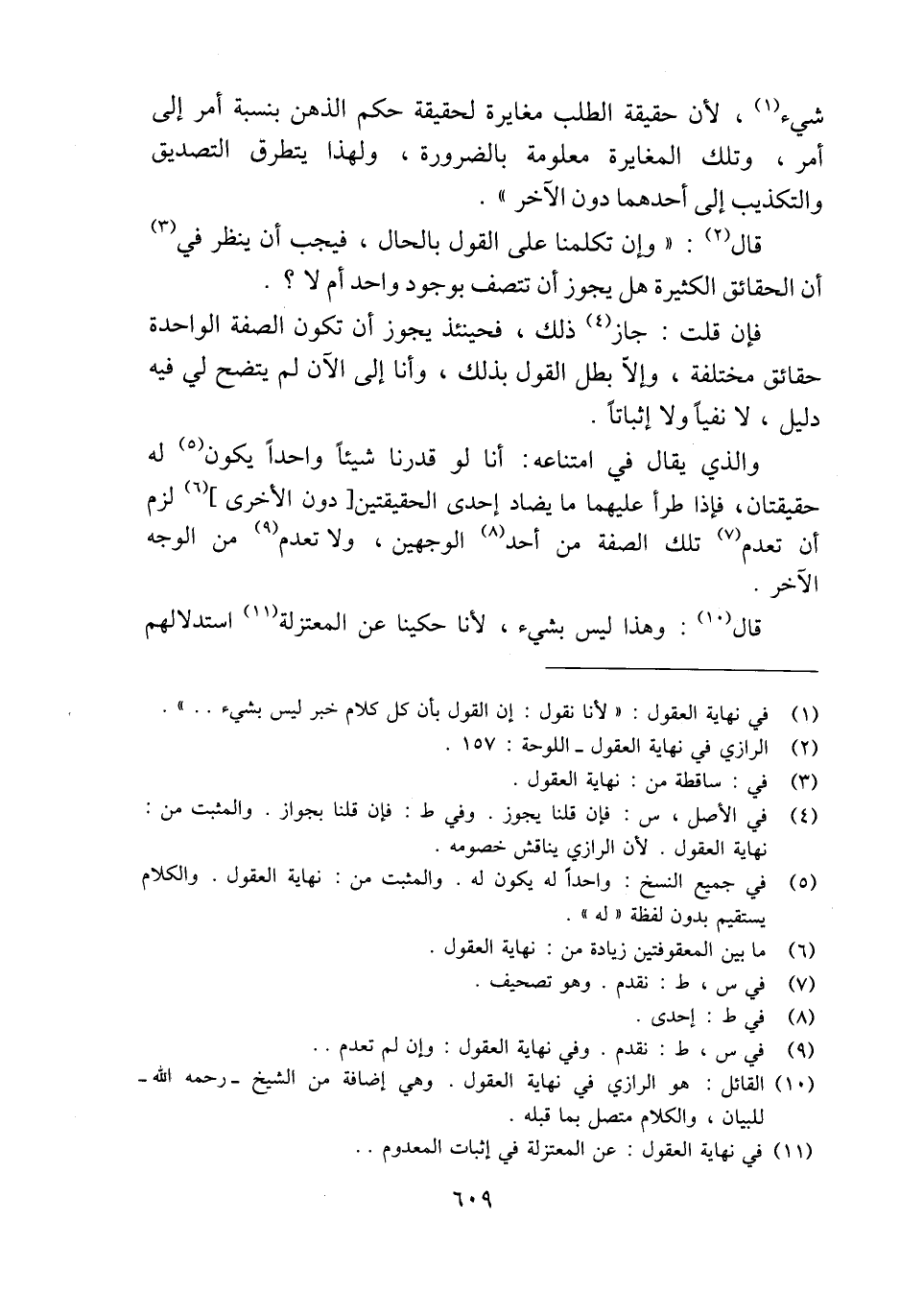 (¬11) في نهاية العقول: عن المعتزلة في إثبات المعدوم. .