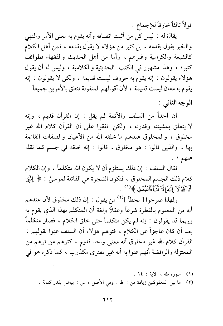 فقال السلف: إن ذلك يستلزم أن لا يكون الله متكلمًا، وإن الكلام كلام ذلك الجسم المخلوق، فتكون الشجرة هي القائلة لموسى: {إِنَّنِي أَنَا اللَّهُ لَا إِلَهَ إلا أَنَا فَاعْبُدْنِي} (¬1).