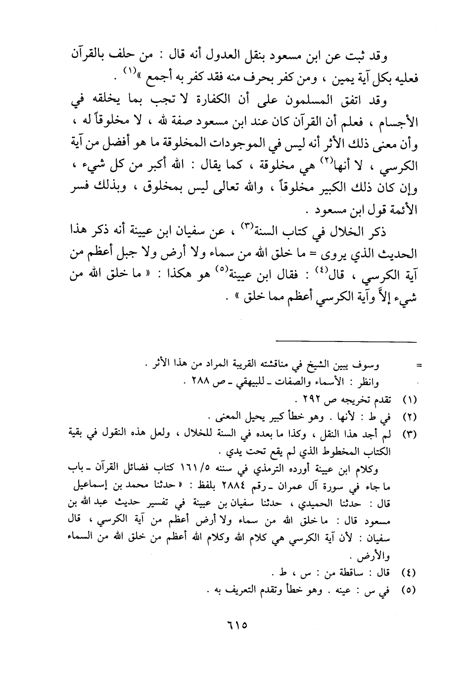 وقد اتفق المسلمون على أن الكفارة لا تجب بما يخلقه في الأجسام، فعلم أن القرآن كان عند ابن مسعود صفة لله، لا مخلوقًا له، وأن معنى ذلك الأثر أنَّه ليس في الموجودات المخلوقة ما هو أفضل من آية الكرسي، لا أنها (¬2) هي مخلوقة، كما يقال: الله أكبر من كل شيء، وإن كان ذلك الكبير مخلوقًا، والله تعالى ليس بمخلوق، وبذلك فسر الأئمة قول ابن مسعود.