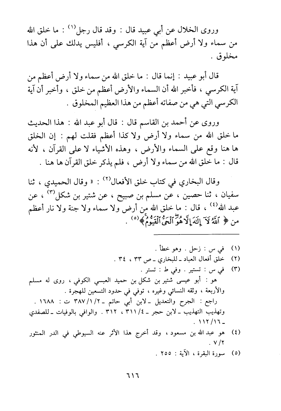 وقال البُخاريّ في كتاب خلق الأفعال (¬2): "وقال الحميدي، ثنا سفيان، ثنا حصين، عن مسلم بن صبيح، عن شتير بن شكل (¬3)، عن عبد الله (¬4)، قال: ما خلق الله من أرض ولا سماء ولا جنة ولا نار أعظم من {اللَّهُ لَا إِلَهَ إلا هُوَ الْحَيُّ الْقَيُّومُ} (¬5).