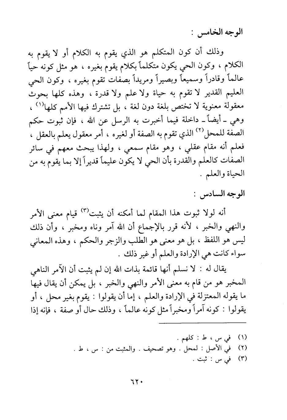 وذلك أن كون المتكلم هو الذي يقوم به الكلام أو لا يقوم به الكلام، وكون الحي يكون متكلمًا بكلام يقوم بغيره، هو مثل كونه حيًّا عالمًا وقادرًا وسميعًا وبصيرًا ومريدًا بصفات تقوم بغيره، وكون الحي العليم القدير لا تقوم به حياة ولا علم ولا قدرة، وهذه كلها بحوث معقولة معنوية لا تختص بلغة دون لغة، بل تشترك فيها الأمم كلها (¬1)، وهي -أيضًا- داخلة فيما أخبرت به الرسل عن الله، فإن ثبوت حكم الصفة للمحل (¬2) الذي تقوم به الصفة أو لغيره، أمر معقول يعلم بالعقل، فعلم أنَّه مقام عقلي، وهو مقام سمعي، ولهذا يبحث معهم في سائر الصفات كالعلم والقدرة بأنَّ الحي لا يكون عليمًا قديرًا إلَّا بما يقوم به من الحياة والعلم.