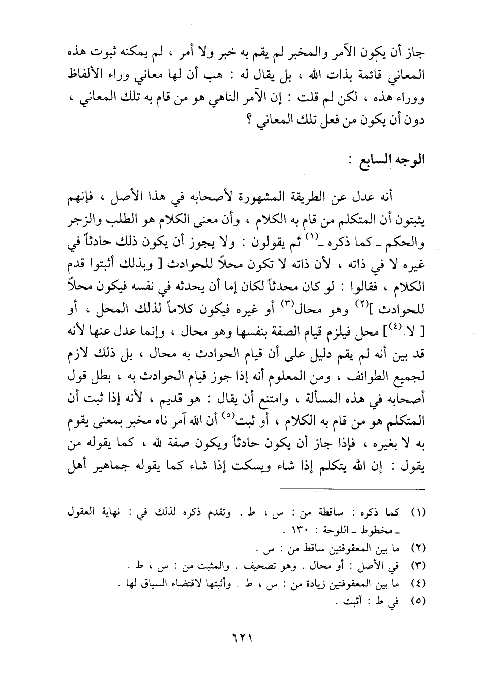 أنَّه عدل عن الطريقة المشهورة لأصحابه في هذا الأصل، فإنهم يثبتون أن المتكلم من قام به الكلام، وأن معنى الكلام هو الطّلب والزجر والحكم -كما ذكره - (¬1) ثم يقولون: ولا يجوز أن يكون ذلك حادثًا في غيره لا في ذاته، لأنَّ ذاته لا تكون محلًا للحوادث [وبذلك أثبتوا قدم الكلام، فقالوا: لو كان محدثًا لكان إما أن يحدثه في نفسه فيكون محلًا للحوادث] (¬2) وهو محال (¬3) أو غيره فيكون كلامًا لذلك المحل، أو [لا (¬4)] محل فيلزم قيام الصفة بنفسها وهو محال، وإنَّما عدل عنها لأنه قد بين أنَّه لم يقم دليل على أن قيام الحوادث به محال، بل ذلك لازم لجميع الطوائف، ومن المعلوم أنَّه إذا جوز قيام الحوادث به، بطل قول أصحابه في هذه المسألة، وامتنع أن يقال: هو قديم، لأنَّه إذا ثبت أن المتكلم هو من قام به الكلام، أو ثبت (¬5) أن الله آمر ناه مخبر بمعنى يقوم به لا بغيره، فإذا جاز أن يكون حادثًا ويكون صفة لله، كما يقوله من يقول: إن الله يتكلم إذا شاء ويسكت إذا شاء كما يقوله جماهير أهل