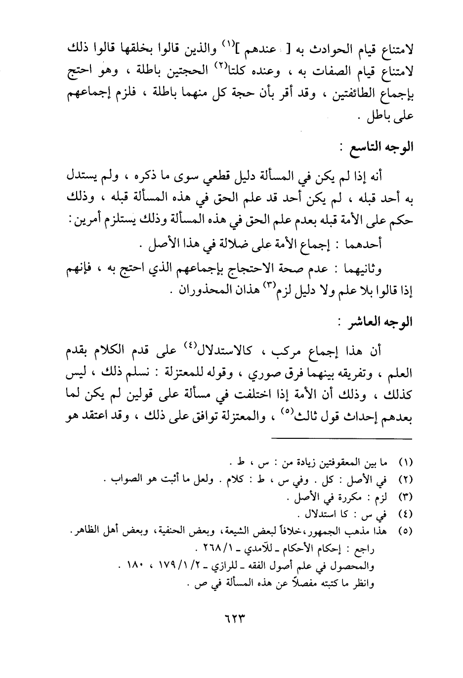 أن هذا إجماع مركب، كالاستدلال (¬4) على قدم الكلام بقدم العلم، وتفريقه بينهما فرق صوري، وقوله للمعتزلة: نسلم ذلك، ليس كذلك، وذلك أن الأمة إذا اختلفت في مسألة على قولين لم يكن لما بعدهم إحداث قول ثالث (¬5)، والمعتزلة توافق على ذلك، وقد اعتقد هو