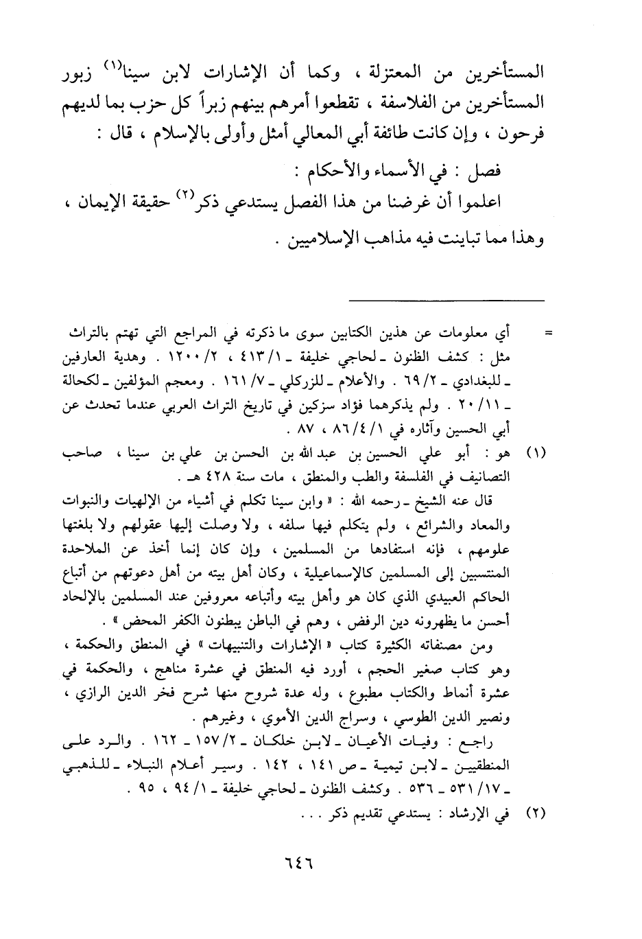 المستأخرين من المعتزلة، وكما أن الإشارات لابن سينا (¬1) زبور المستأخرين من الفلاسفة، تقطعوا أمرهم بينهم زبرًا كل حزب بما لديهم فرحون، وإن كانت طائفة أبي المعالي أمثل وأولى بالإسلام، قال: فصل: في الأسماء والأحكام: