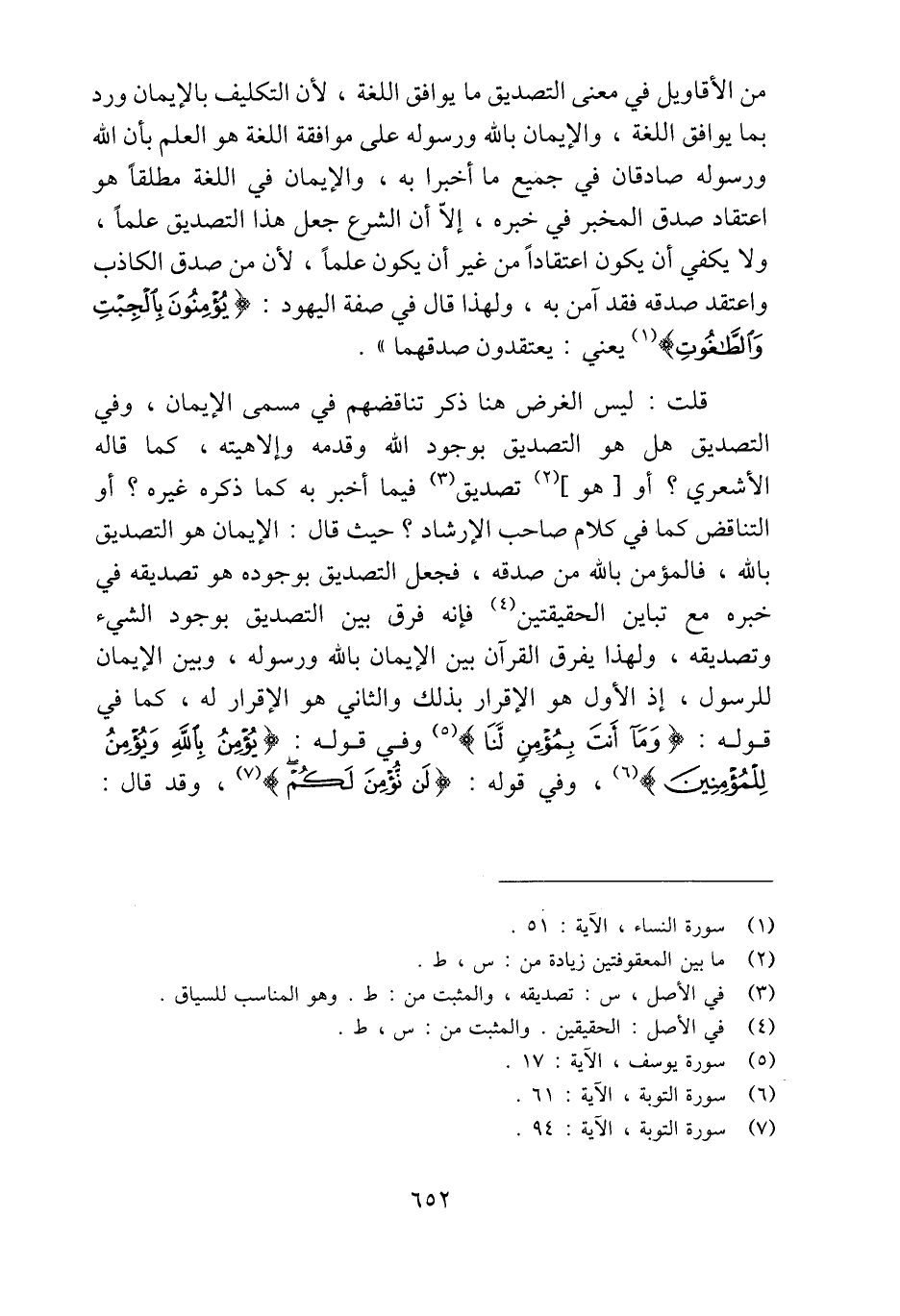 قلت: ليس الغرض هنا ذكر تناقضهم في مسمى الإيمان، وفي التصديق هل هو التصديق بوجود الله وقدمه وإلاهيته، كما قاله الأشعري؟ أو [هو] (¬2) تصديق (¬3) فيما أخبر به كما ذكره غيره؟ أو التناقض كما في كلام صاحب الإرشاد؟ حيث قال: الإيمان هو التصديق بالله، فالمؤمن بالله من صدقه، فجعل التصديق بوجوده هو تصديقه في خبره مع تباين الحقيقتين (¬4) فإنه فرق بين التصديق بوجود الشيء وتصديقه، ولهذا يفرق القرآن بين الإيمان بالله ورسوله، وبين الإيمان للرسول، إذ الأول هو الإقرار بذلك والثاني هو الإقرار له، كما في قوله: {وَمَا أَنْتَ بِمُؤمِنٍ لَنَا} (¬5) وفي قوله {يُؤمِنُ بِاللَّهِ وَيُؤمِنُ لِلْمُؤمِنِيْنَ} (¬6)، وفي قوله: {لَنْ نُؤْمِنَ لَكُمْ} (¬7)، وقد قال:
