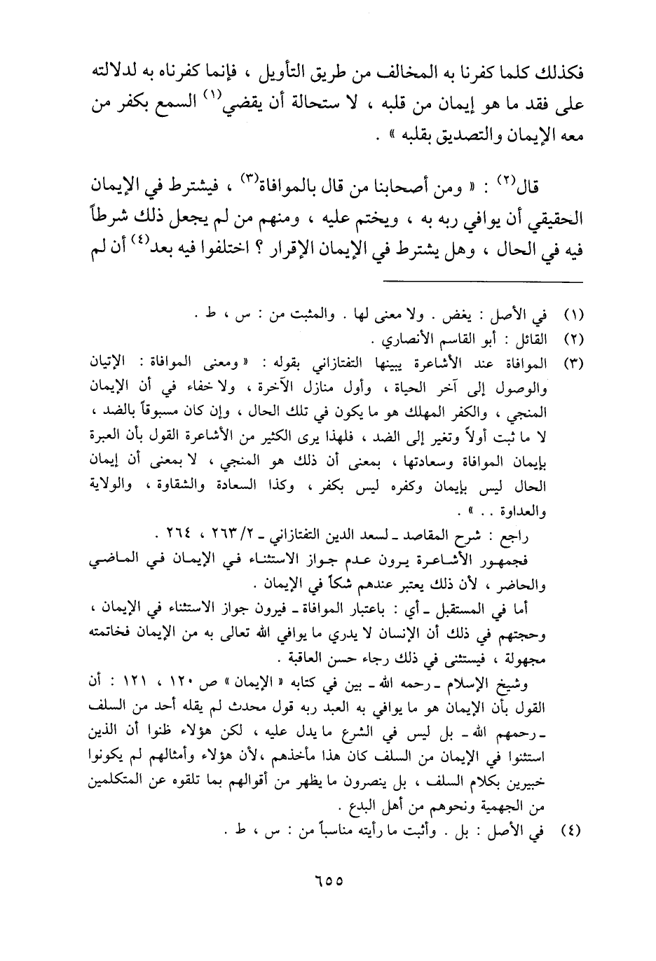 (¬3) الموافاة عند الأشاعرة يبينها التفتازاني بقوله: "ومعنى الموافاة: الإتيان والوصول إلى آخر الحياة، وأول منازل الآخرة، ولا خفاء في أن الإيمان المنجي، والكفر المهلك هو ما يكون في تلك الحال، وإن كان مسبوقًا بالضد، لا ما ثبت أولًا وتغير إلى الضد، فلهذا يرى الكثير من الأشاعرة القول بأن العبرة بإيمان الموافاة وسعادتها، بمعنى أن ذلك هو المنجي، لا بمعنى أن إيمان الحال ليس بإيمان وكفره ليس بكفر، وكذا السعادة والشقاوة، والولاية والعداوة. . ".