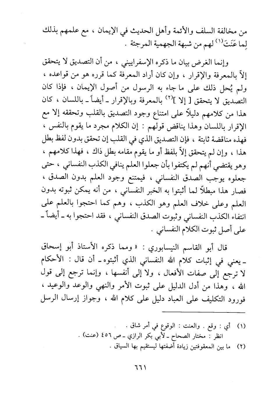 وإنما الغرض بيان ما ذكره الإسفراييني، من أن التصديق لا يتحقق إلّا بالمعرفة والإقرار، وإن كان أراد المعرفة كما قرره هو من قواعده، ولم يُحل ذلك على ما جاء به الرسول من أصول الإيمان، فإذا كان التصديق لا يتحقق [إلا] (¬2) بالمعرفة وبالإقرار -أيضًا- باللسان، كان هذا من كلامهم دليلًا على امتناع وجود التصديق بالقلب وتحققه إلا مع الإقرار باللسان وهذا يناقض قولهم: إن الكلام مجرد ما يقوم بالنفس، فهذه مناقضة ثابتة، فإن التصديق الَّذي في القلب إن تحقق بدون لفظ بطل هذا، وإن لم يتحقق إلَّا بلفظ أو ما يقوم مقامه بطل ذاك، فهذا كلامهم، وهو يقتضي أنهم لم يكتفوا بأن جعلوا العلم ينافي الكذب النفساني، حتَّى جعلوه يوجب الصدق النفساني، فيمتنع وجود العلم بدون الصدق، فصار هذا مبطلًا لما أثبتوا به الخبر النفساني، من أنَّه يمكن ثبوته بدون العلم وعلى خلاف العلم وهو الكذب، وهم كما احتجوا بالعلم على انتفاء الكذب النفساني وثبوت الصدق النفساني، فقد احتجوا به -أيضًا- على أصل ثبوت الكلام النفساني.