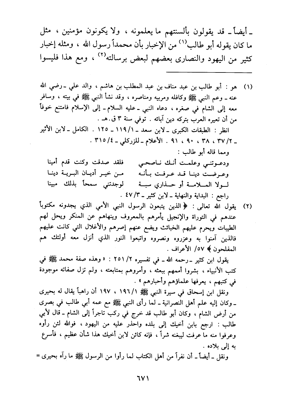 (¬1) هو: أبو طالب بن عبد مناف بن عبد المطلب بن هاشم، والد علي - رضي الله عنه - وعم النبي - صلى الله عليه وسلم - وكافله ومربيه ومناصره، وقد نشأ النبي - صلى الله عليه وسلم - في بيته، وسافر معه إلى الشام في صغره، دعاه النبي - عليه السلام - إلى الإسلام فامتغ خوفًا من أن تعيره العرب بتركه دين آبائه. توفي سنة 3 ق. هـ.