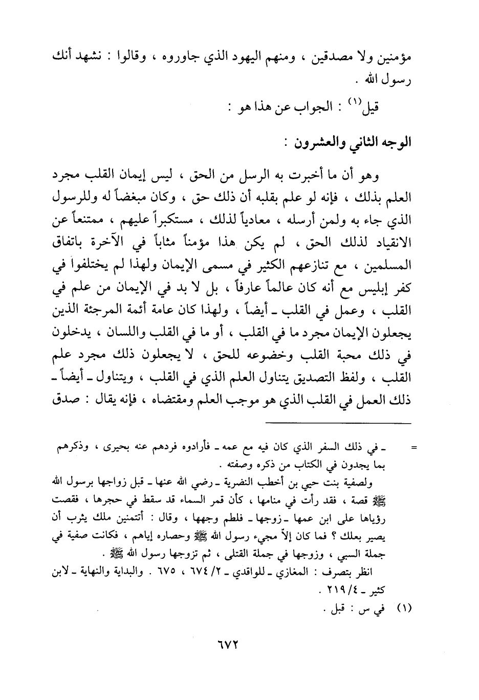 وهو أن ما أخبرت به الرسل من الحق، ليس إيمان القلب مجرد العلم بذلك، فإنه لو علم بقلبه أن ذلك حق، وكان مبغضًا له وللرسول الَّذي جاء به ولمن أرسله، معاديًا لذلك، مستكبرًا عليهم، ممتنعًا عن الانقياد لذلك الحق، لم يكن هذا مؤمنًا مثابًا في الآخرة باتفاق المسلمين، مع تنازعهم الكثير في مسمى الإيمان ولهذا لم يختلفوا في كفر إبليس مع أنَّه كان عالمًا عارفًا، بل لا بد في الإيمان من علم في القلب، وعمل في القلب - أيضًا، ولهذا كان عامة أئمة المرجئة الذين يجعلون الإيمان مجرد ما في القلب، أو ما في القلب واللسان، يدخلون في ذلك محبة القلب وخضوعه للحق، لا يجعلون ذلك مجرد علم القلب، ولفظ التصديق يتناول العلم الَّذي في القلب، ويتناول -أيضًا- ذلك العمل في القلب الَّذي هو موجب العلم ومقتضاه، فإنه يقال: صدق