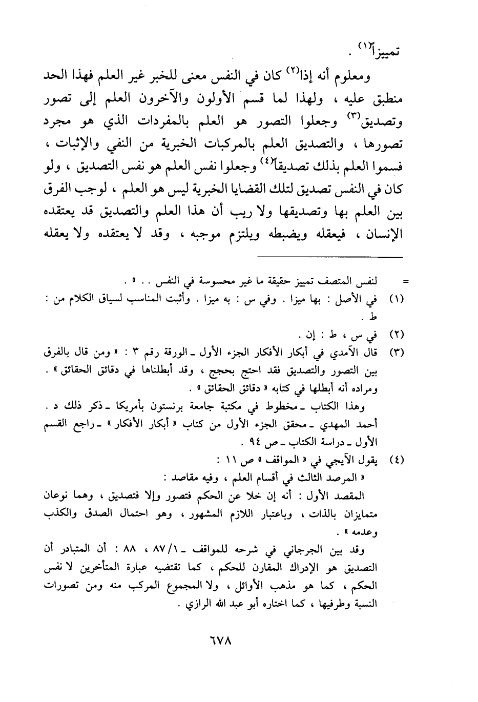 (¬3) قال الآمدي في أبكار الأفكار الجزء الأول - الورقة رقم 3: "ومن قال بالفرق بين التصور والتصديق فقد احتج بحجج، وقد أبطلناها في دقائق الحقائق".