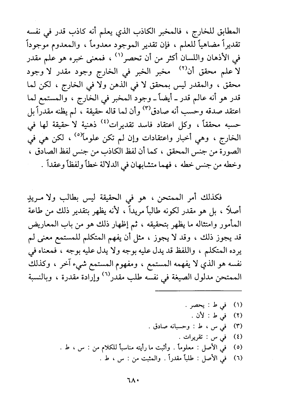 المطابق للخارج، فالمخبر الكاذب الَّذي يعلم أنَّه كاذب قدر في نفسه تقديرًا مضاهيًا للعلم، فإن تقدير الموجود معدومًا، والمعدوم موجودًا في الأذهان واللسان أكثر من أن تحصر (¬1)، فمعنى خبره هو علم مقدر لا علم محقق أن (¬2) مخبر الخبر في الخارج وجود مقدر لا وجود محقق، والمقدر ليس بمحقق لا في الذهن ولا في الخارج، لكن لما قدر هو أنَّه عالم قدر -أيضًا- وجود المخبر في الخارج، والمستمع لما اعتقد صدقه وحسب أنَّه صادق (¬3) وأن لما قاله حقيقة، لم يظنه مقدرًا بل حسبه محققًا، وكل اعتقاد فاسد تقديرات (¬4) ذهنية لا حقيقة لها في الخارج، وهي أخبار واعتقادات وإن لم تكن علومًا (¬5)، لكن هي في الصورة من جنس المحقق، كما أن لفظ الكاذب من جنس لفظ الصادق، وخطه من جنس خطه، فهما متشابهان في الدلالة خطًا ولفظًا وعقدًا.