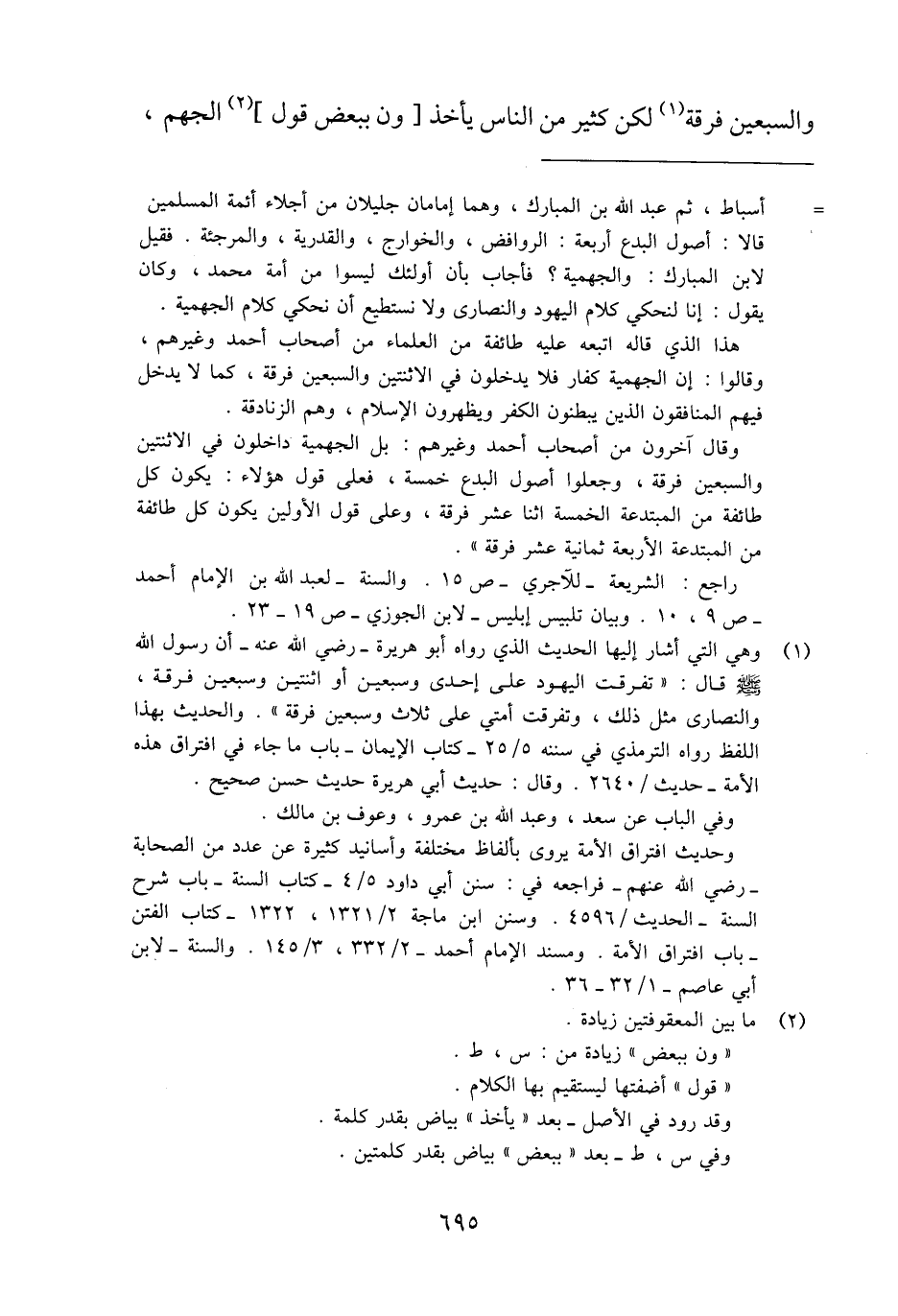 والسبعين فرقة (¬1) لكن كثير من الناس يأخذ [دون ببعض قول] (¬2) الجهم،