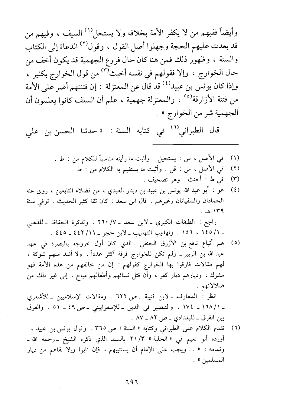 (¬6) تقدم الكلام على الطبراني وكتابه "السنة" ص: 365. وقول يونس بن عبيد، أورده أبو نعيم في "الحلية" 3/ 21 بالسند الَّذي ذكره الشيخ -رحمه الله- وتمامه: ". . ويجب على الإمام أن يستتيبهم، فإن تابوا وإلا نفاهم من ديار المسلمين".