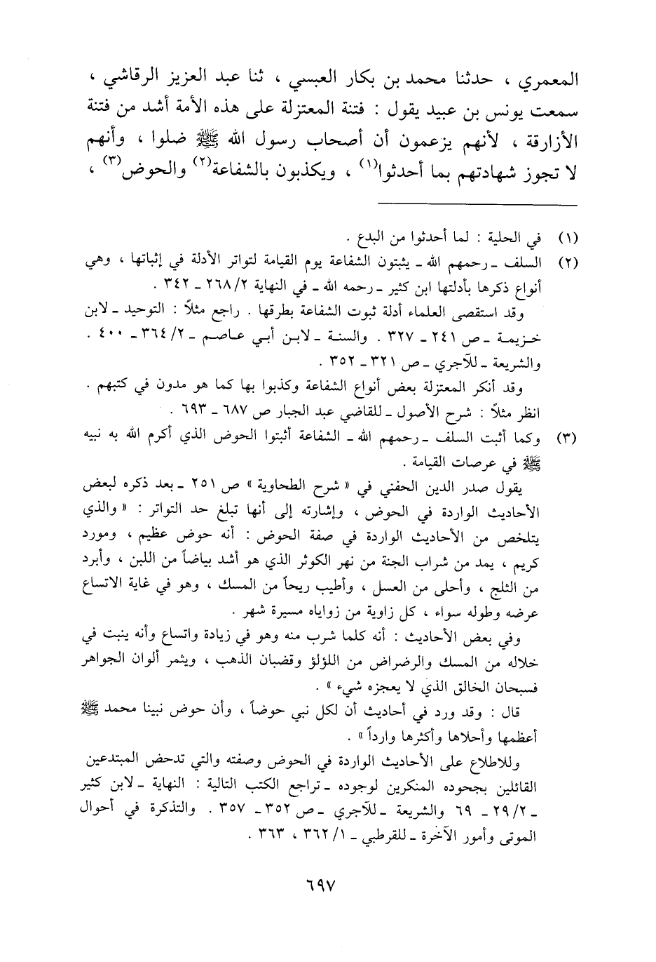 (¬3) وكما أثبت السلف -رحمهم الله- الشفاعة أثبتوا الحوض الَّذي أكرم الله به نبيه - صلى الله عليه وسلم - في عرصات القيامة.