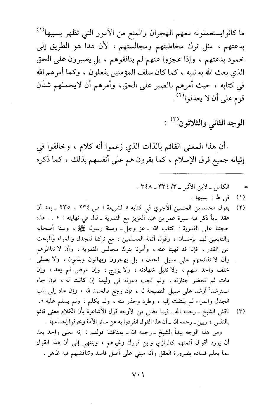 (¬3) ناقش الشيخ -رحمه الله- فيما مضى من الأوجه قول الأشاعرة بأن الكلام معنى قائم بالنفس، وبين -رحمه الله- أن هذا القول انفردوا به عن سائر الأمة وخرقوا إجماعها.