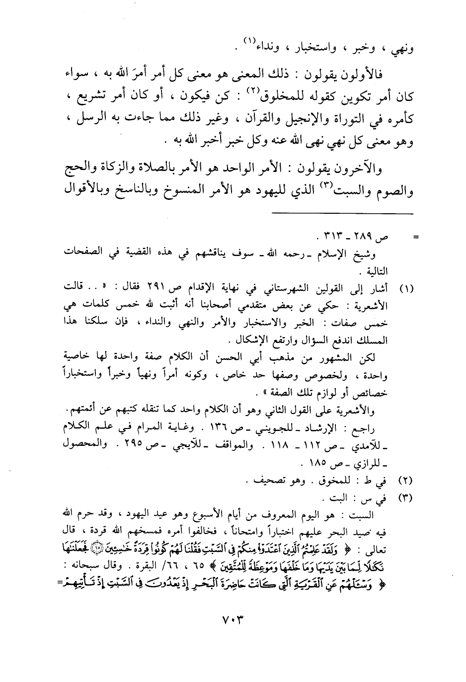 (¬1) أشار إلى القولين الشهرستاني في نهاية الإقدام ص: 291 فقال: (. . قالت الأشعرية: حكي عن بعض متقدمي أصحابنا أنه أثبت لله خمس كلمات هي خمس صفات: الخبر والاستخبار والأمر والنهي والنداء، فإن سلكنا هذا المسلك اندفع السؤال وارتفع الإشكال.