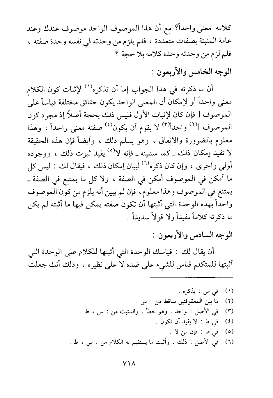 أن يقال لك: قياسك الوحدة التي أثبتها للكلام على الوحدة التي أثبتها للمتكلم قياس للشيء على ضده لا على نظيره، وذلك أنك جعلت