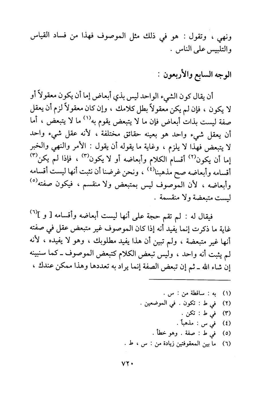 أن يقال كون الشيء الواحد ليس بذي أبعاض إما أن يكون معقولًا أو لا يكون، فإن لم يكن معقولًا بطل كلامك، وإن كان معقولًا لزم أن يعقل صفة ليست بذات أبعاض فإن ما لا يتبعض يقوم به (¬1) ما لا يتبعض، أما أن يعقل شيء واحد هو بعينه حقائق مختلفة؛ لأنه عقل شيء واحد لا يتبعض فهذا لا يلزم، وغاية ما يقوله أن يقول: الأمر والنهي والخبر إما أن يكون (¬2) أقسام الكلام وأبعاضه أو لا يكون (3)، فإذا لم يكن (¬3) أقسامه وأبعاضه صح مذهبنا (¬4)، ونحن غرضنا أن نثبت أنها ليست أقسامه وأبعاضه؛ لأن الموصوف ليس بمتبعض ولا منقسم، فيكون صفته (¬5) ليست متبعضة ولا منقسمة.