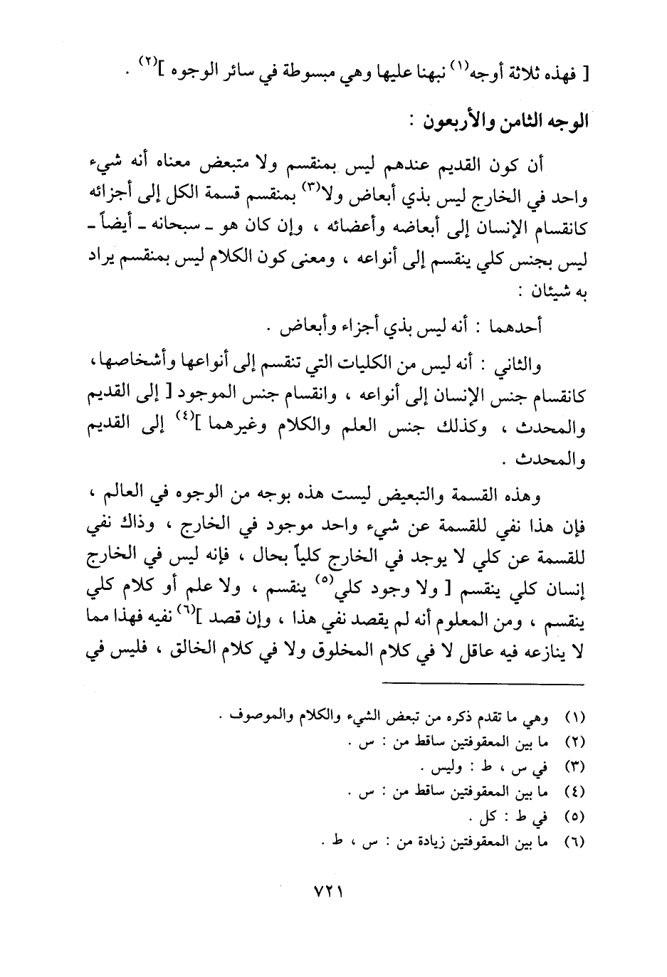 أن كون القديم عندهم ليس بمنقسم ولا متبعض معناه أنه شيء واحد في الخارج ليس بذي أبعاض ولا (¬3) بمنقسم قسمة الكل إلى أجزائه كانقسام الإنسان إلى أبعاضه وأعضائه، وإن كان هو -سبحانه -أيضًا- ليس بجنس كلي ينقسم إلى أنواعه، ومعنى كون الكلام ليس بمنقسم يراد به شيئان: