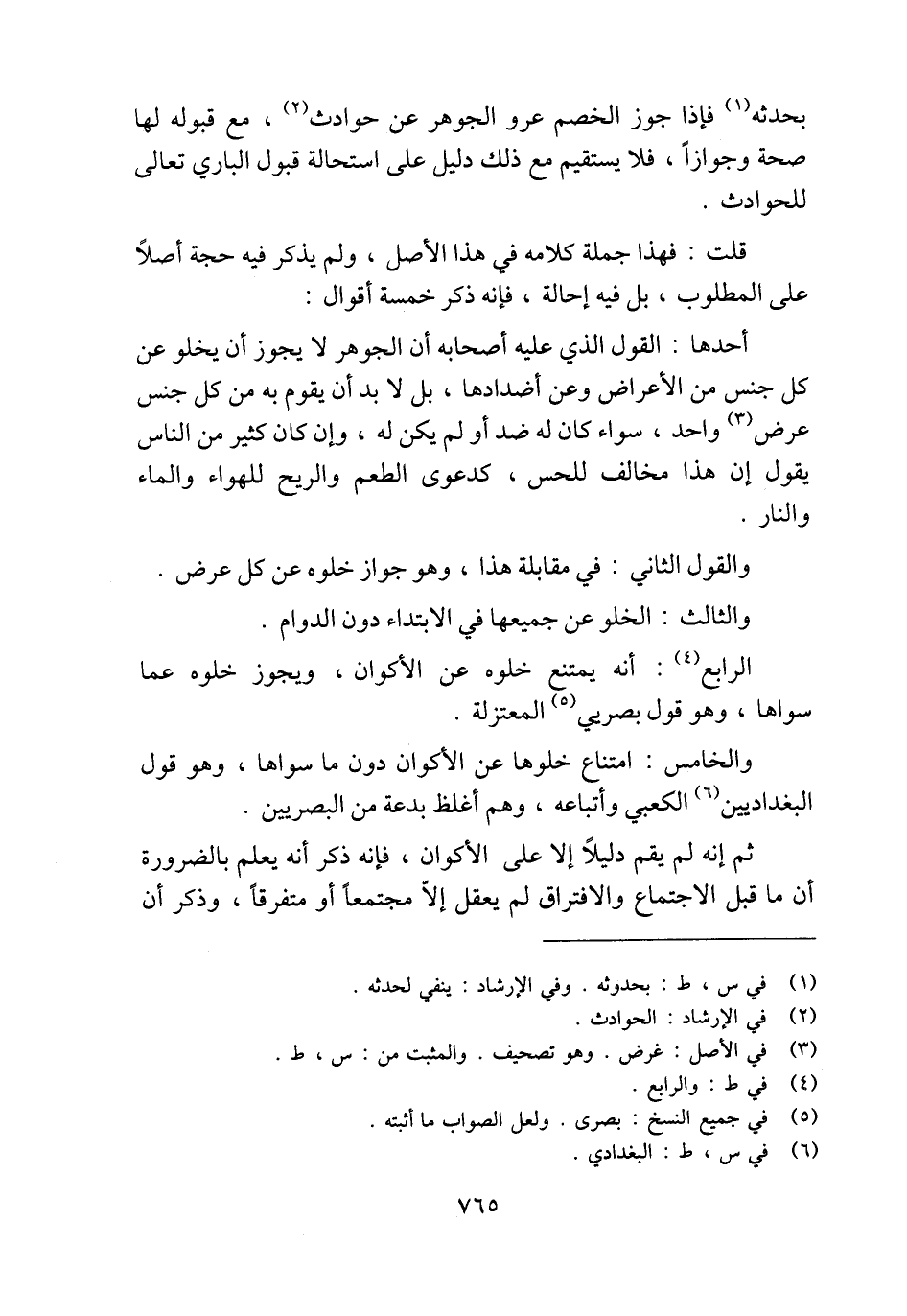 الرابع (¬4): أنه يمتنع خلوه عن الأكوان، ويجوز خلوه عما سواها، وهو قول بصري (¬5) المعتزلة.