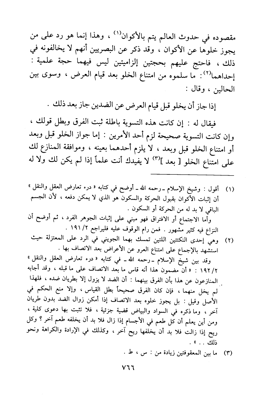 (¬1) أقول: وشيخ الإسلام -رحمه الله- أوضح في كتابه "درء تعارض العقل والنقل" أن إثبات الأكوان بقبول الحركة والسكون هو الذي لا يمكن دفعه، لأن الجسم الباقي لا بد له من الحركة أو السكون.