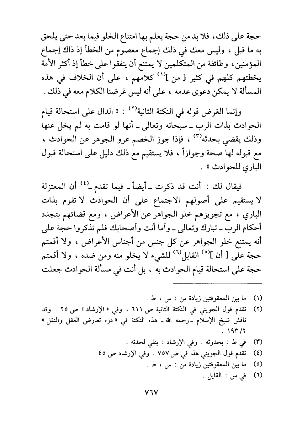 وإنما الغرض قوله في النكتة الثانية (¬2): "الدال على استحالة قيام الحوادث بذات الرب -سبحانه وتعالى- أنها لو قامت به لم يخل عنها وذلك يقضي بحدثه (¬3)، فإذا جوز الخصم عرو الجوهر عن الحوادث، مع قبوله لها صحة وجوازًا، فلا يستقيم مع ذلك دليل على استحالة قبول الباري للحوادث".