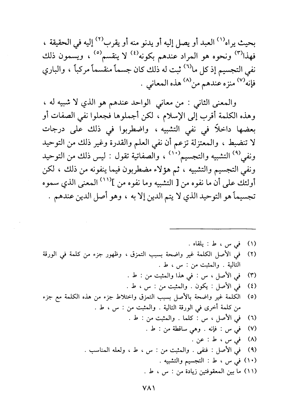 بحيث يراه (¬1) العبد أو يصل إليه أو يدنو منه أو يقرب (¬2) إليه في الحقيقة، فهذا (¬3) ونحوه هو المراد عندهم بكونه (¬4) لا ينقسم (¬5)، ويسمون ذلك نفي التجسيم إذ كل ما (¬6) ثبت له ذلك كان جسمًا منقسمًا مركبًا، والباري فإنه (¬7) منزه عندهم من (¬8) هذه المعاني.