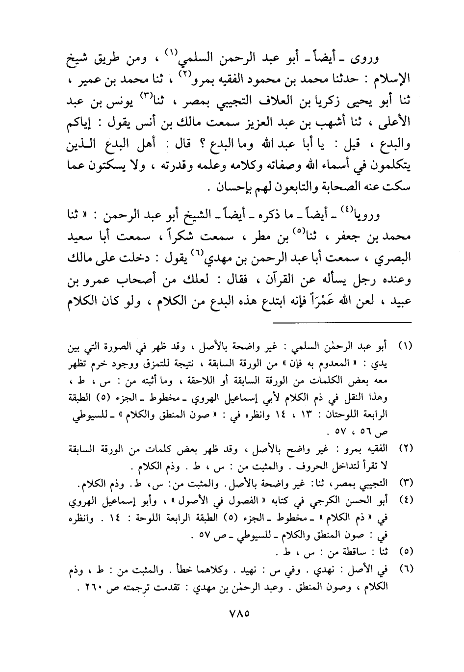 (¬1) أبو عبد الرحمن السلمي: غير واضحة بالأصل، وقد ظهر في الصورة التي بين يدي: "المعدوم به فإن" من الورقة السابقة، نتيجة للتمزق ووجود خرم تظهر معه بعض الكلمات من الورقة السابقة أو اللاحقة، وما أثبته من: س، ط، وهذا النقل في ذم الكلام لأبي إسماعيل الهروي -مخطوط- الجزء (5) الطبقة الرابعة اللوحتان: 13، 14 وانظره في: "صون المنطق والكلام" -للسيوطي ص: 57، 56.