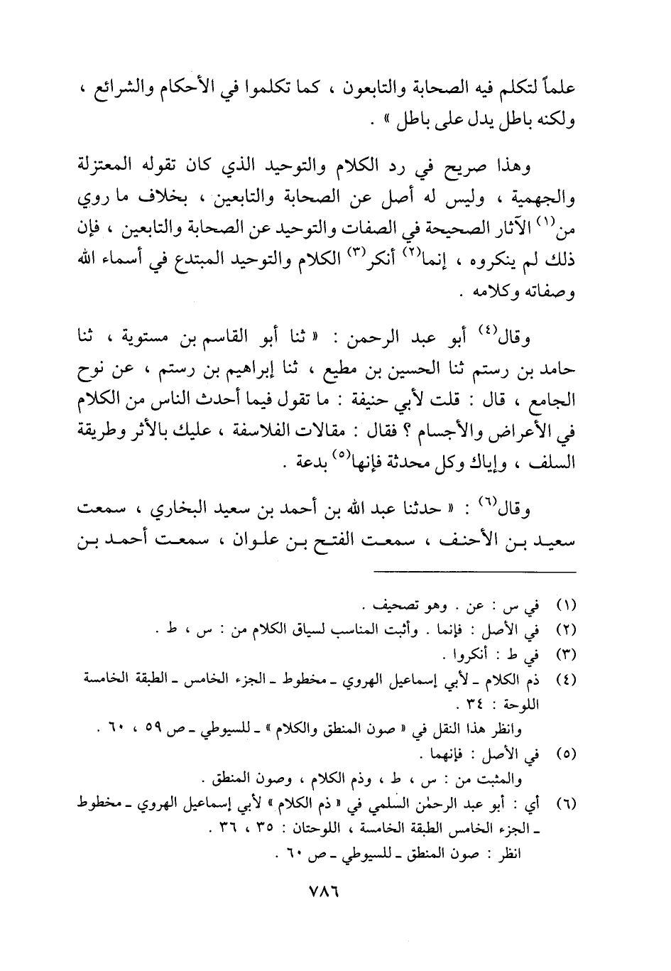 (¬6) أي: أبو عبد الرحمن السلمي في "ذم الكلام" لأبي إسماعيل الهروي -مخطوط- الجزء الخامس الطبقة الخامسة، اللوحتان: 35، 36.