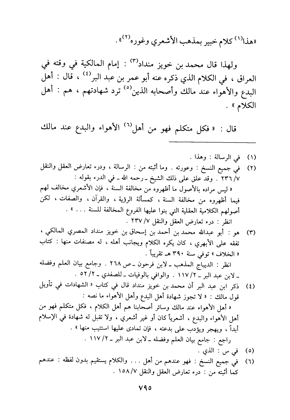 (¬6) في جميع النسخ: فهو عندهم من أهل. . . والكلام يستقيم بدون لفظه: عندهم كما أثبته من: درء تعارض العقل والنقل 7/ 158.