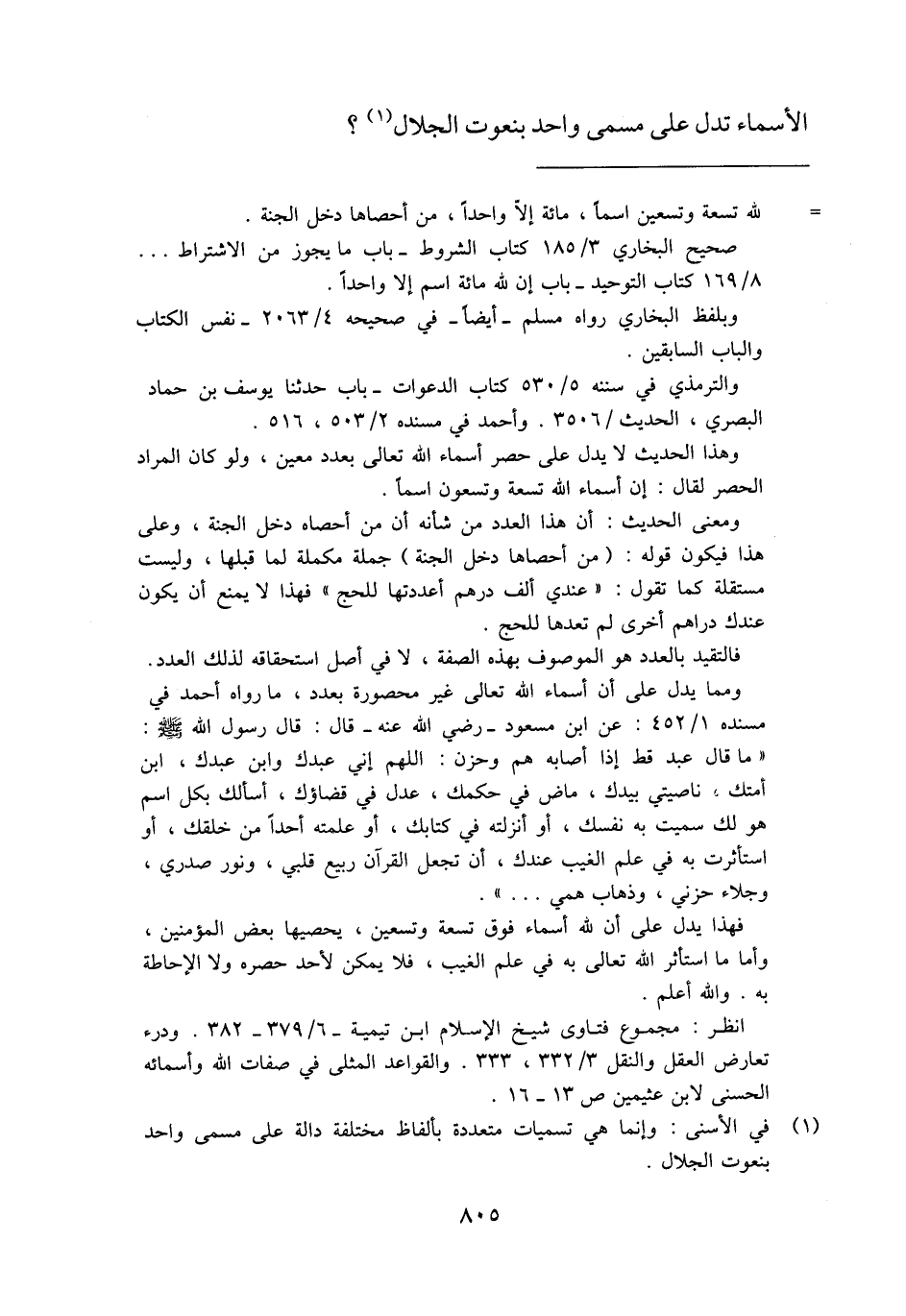 (¬1) في الأسنى: وإنما هي تسميات متعددة بألفاظ مختلفة دالة على مسمى واحد بنعوت الجلال.