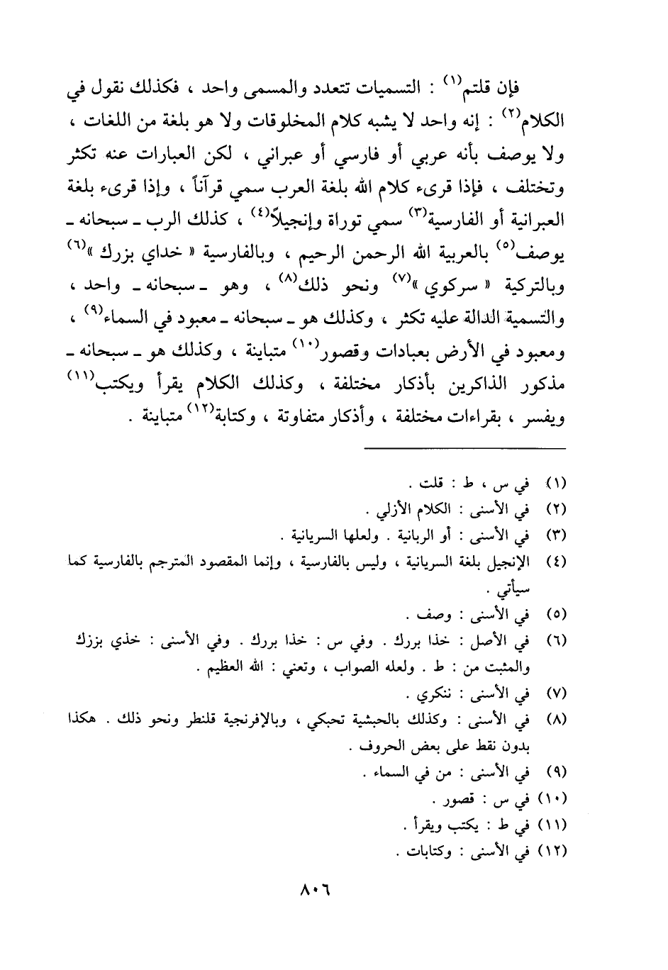 فإن قلتم (¬1): التسميات تتعدد والمسمى واحد، فكذلك نقول في الكلام (¬2): إنه واحد لا يشبه كلام المخلوقات ولا هو بلغة من اللغات، ولا يوسف بأنه عربي أو فارسي أو عبراني، لكن العبارات عنه تكثر وتختلف، فإذا قرئ كلام الله بلغة العرب سمي قرآنًا، وإذا قرئ بلغة العبرانية أو الفارسية (¬3) سمي توراة وإنجيلًا (¬4)، كذلك الرب -سبحانه- يوصف (¬5) بالعربية الله الرحمن الرحيم، وبالفارسية "خداي بزرك" (¬6) وبالتركية "سركوي" (¬7) ونحو ذلك (¬8)، وهو -سبحانه- واحد، والتسمية الدالة عليه تكثر، وكذلك هو -سبحانه- معبود في السماء (¬9)، ومعبود في الأرض بعبادات وقصور (¬10) متباينة، وكذلك هو -سبحانه- مذكور الذاكرين بأذكار مختلفة، وكذلك الكلام يقرأ ويكتب (¬11) ويفسر، بقراءات مختلفة، وأذكار متفاوتة، وكتابة (¬12) متباينة.