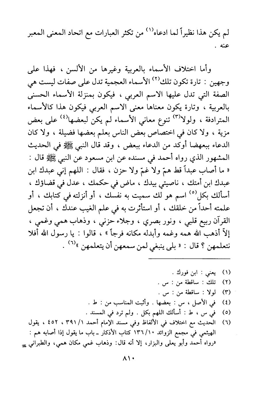 وأما اختلاف الأسماء بالعربية وغيرها من الألسن، فهذا على وجهين: تارة تكون تلك (¬2) الأسماء العجمية تدل على صفات ليست هي الصفة التي تدل عليها الاسم العربي، فيكون بمنزلة الأسماء الحسنى بالعربية، وتارة يكون معناها معنى الاسم العربي فيكون هذا كالأسماء المترادفة، ولولا (¬3) تنوع معاني الأسماء لم يكن لبعضها (¬4) على بعض مزية، ولا كان في اختصاص بعض الناس بعلم بعضها فضيلة، ولا كان الدعاء ببعضها أوكد من الدعاء ببعض، وقد قال النبي - صلى الله عليه وسلم - في الحديث المشهور الذي رواه أحمد في مسنده عن ابن مسعود عن النبي - صلى الله عليه وسلم - قال: "ما أصاب عبدًا قط همّ ولا غمّ ولا حزن، فقال: اللهم إني عبدك ابن عبدك ابن أمتك، ناصيتي بيدك، ماض في حكمك، عدل في قضاؤك، أسألك بكل (¬5) اسم هو لك سميت به نفسك، أو أنزلته في كتابك، أو علمته أحدًا من خلقك، أو استأثرت به في علم الغيب عندك، أن تجعل القرآن ربيع قلبي، ونور بصري، وجلاء حزني، وذهاب همي وغمي، إلّا أذهب الله همه وغمه وأبدله مكانه فرجًا"، قالوا: يا رسول الله أفلا نتعلمهن؟ قال: "بلى ينبغي لمن سمعهن أن يتعلمهن" (¬6).