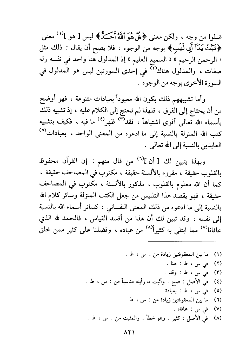ضلوا من وجه، ولكن معنى {قُلْ هُوَ اللَّهُ أَحَدٌ} ليس [هو] (¬1) معنى {تَبَّتْ يَدَا أَبِي لَهَبٍ وَتَبَّ} بوجه من الوجوه، فلا يصح أن يقال: ذلك مثل "الرحمن الرحيم" "السميع العليم" إذ المدلول هنا واحد في نفسه وله صفات، والمدلول هناك (¬2) في إحدى السورتين ليس هو المدلول في السورة الأخرى بوجه من الوجوه.