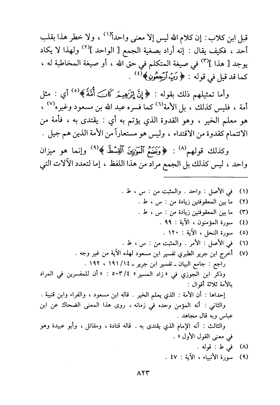وأما تمثيلهم ذلك بقوله: {إِنَّ إِبْرَهِيمَ كان أُمَّةً} (¬5) أي: مثل أمة، فليس كذلك، بل الأمة (¬6) كما فسره عبد الله بن مسعود وغيره (¬7)، هو معلم الخير، وهو القدوة الذي يؤتم به أي: يقتدى به، فأمة من الائتمام كقدوة من الاقتداء، وليس هو مستعارًا من الأمة الذين هم جيل.
